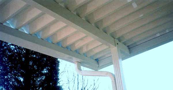 The latest design offered in the industry today! Eliminates nesting of birds and other pests, and offers a beautiful, all-aluminum ceiling area. Features a 6", easy to clean gutter system, heavy-duty posts and beams, and custom manufacturing to any size. Satisfaction guaranteed with a 25 year factory warranty!